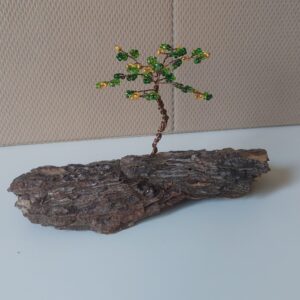 Groene bladeren met oranje bloemen en bruine stam op schors