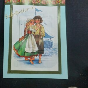 Pyramide kaart jong volwassen stel met zeilboot op de achtergrond met tekst gefeliciteerd
